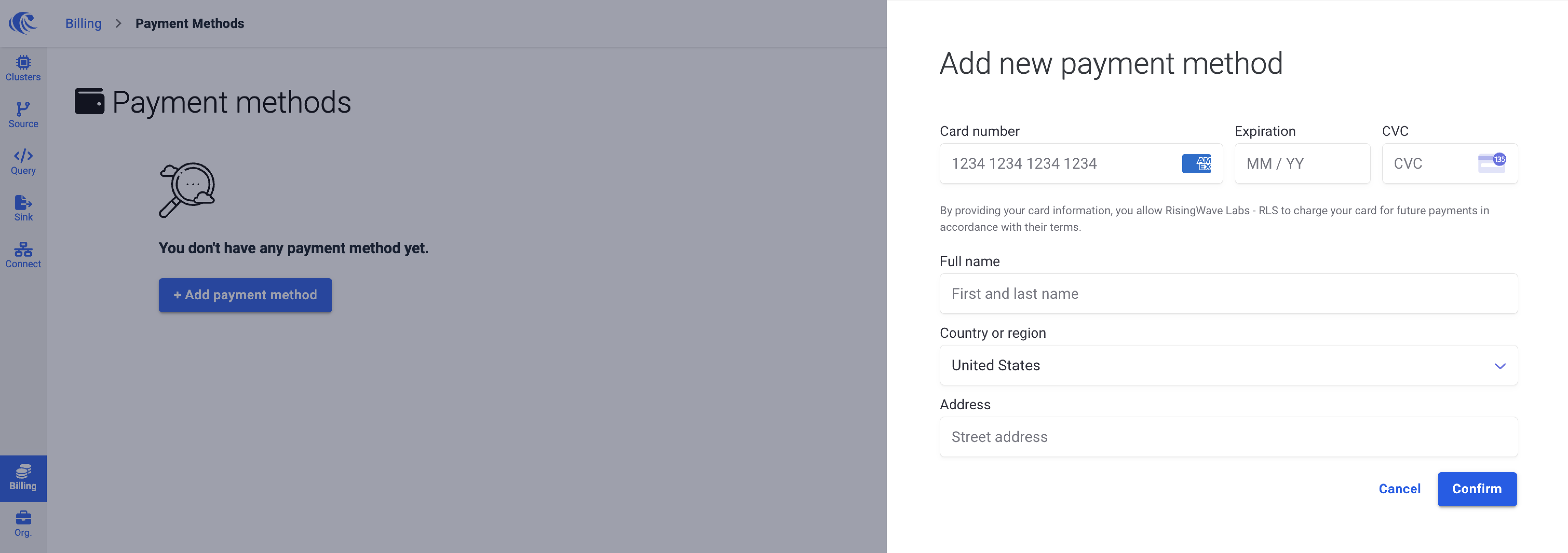 Currently, RisingWave Cloud only supports credit cards as the payment method.