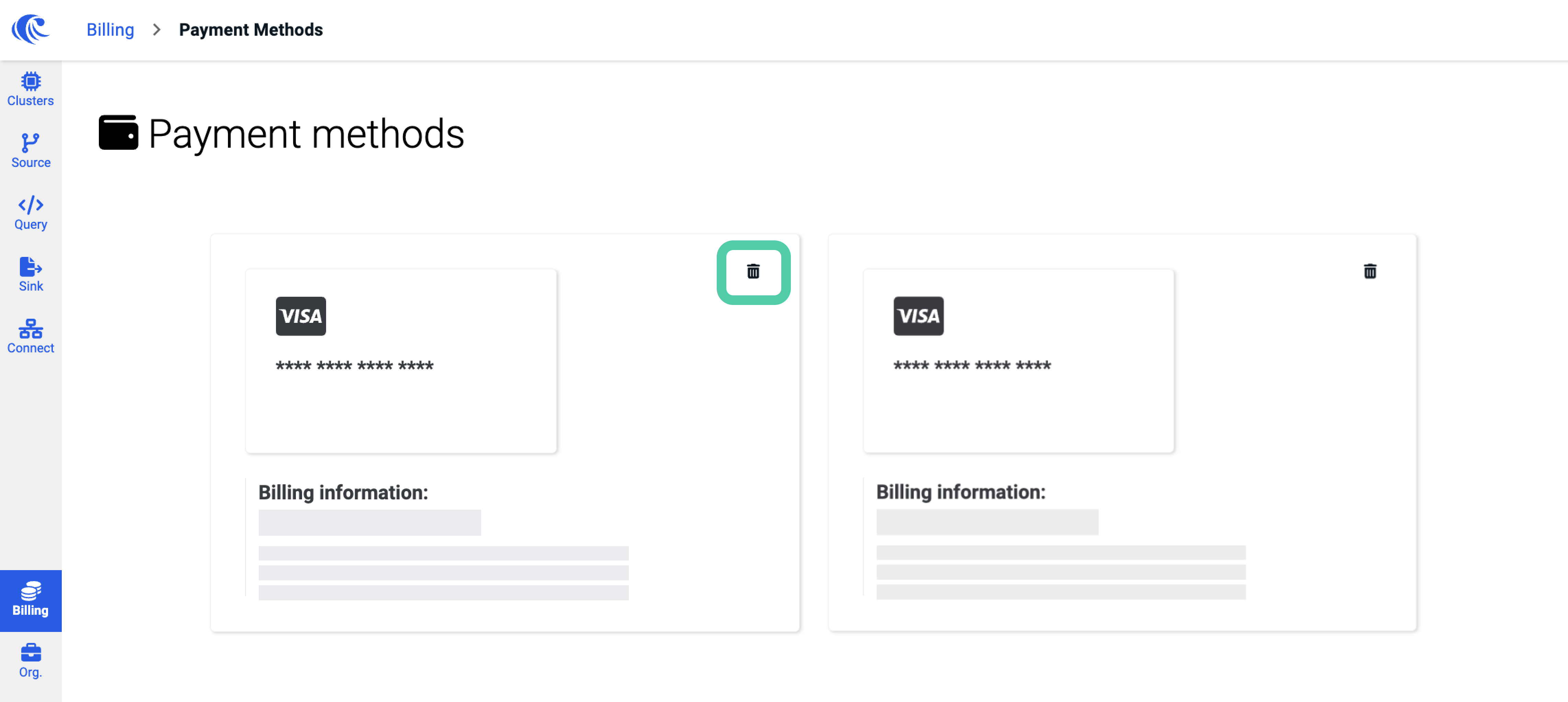 - Click the trashcan/delete button on the top right of the payment method you want to delete.