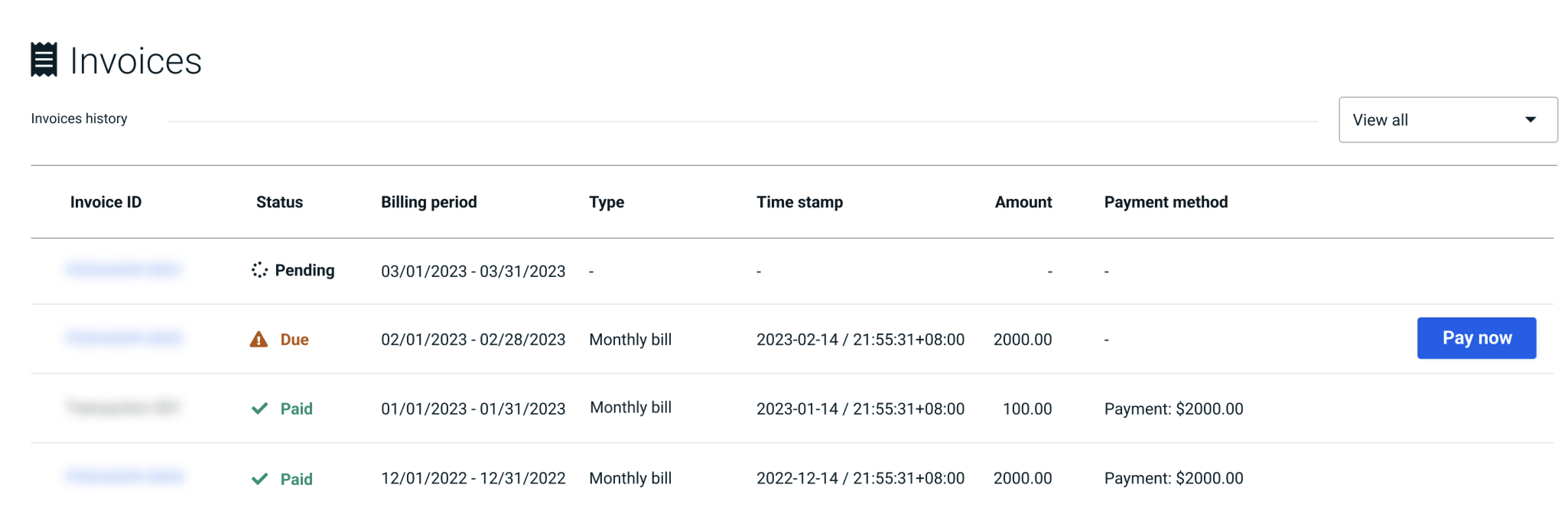 At the start of each month, you’ll receive an invoice that consolidates the usage and associated costs for all your projects from the preceding month. Your invoices provide a record of your usage and payments. It includes:- Invoice ID: Unique identifiers for each invoice. You can click on the invoice ID to view the detailed breakdown of the invoice. See details in Check spending details.