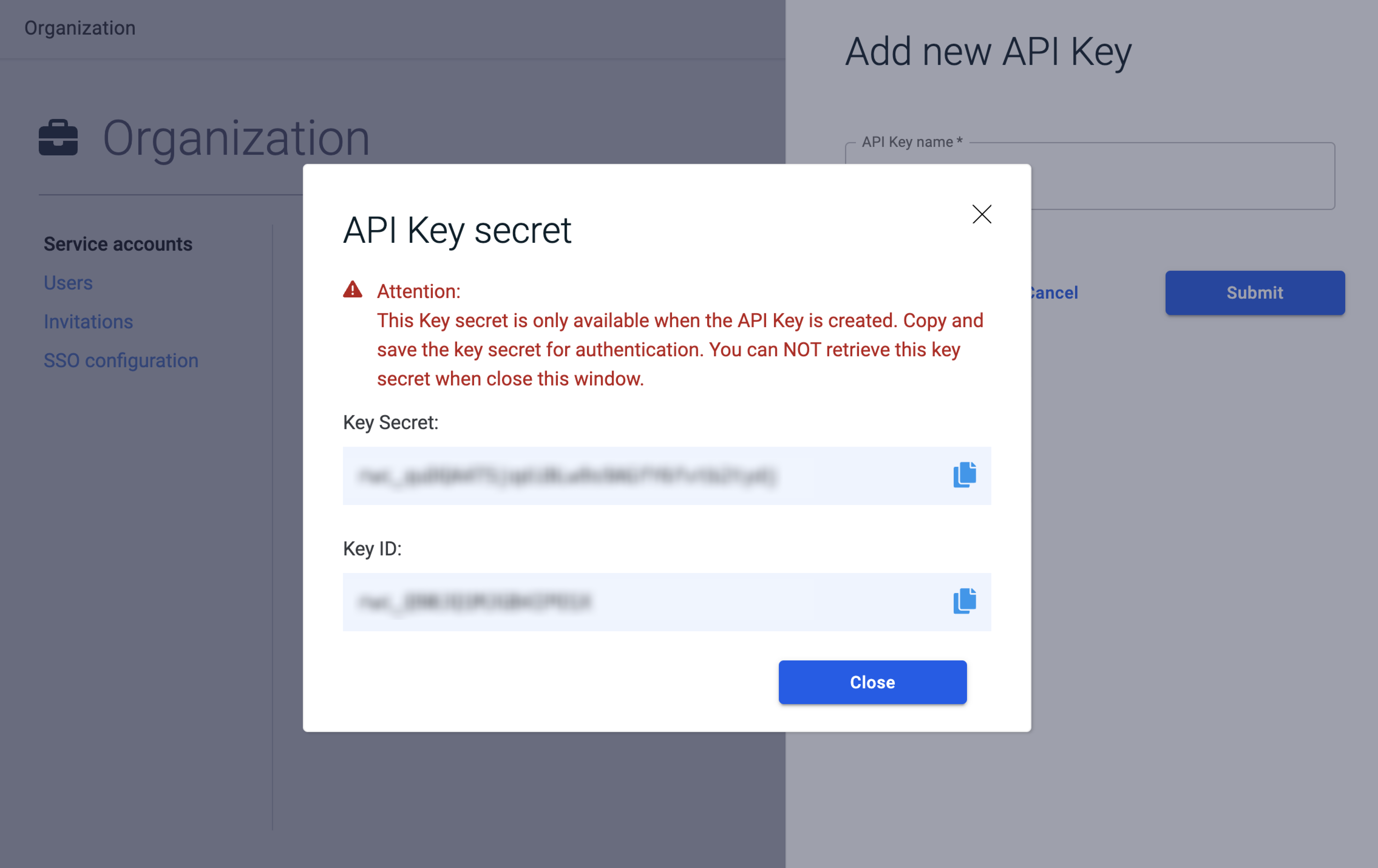 The secret will be shown only once. After you close the dialog, you won’t be able to retrieve it. If you lose the secret, you have to generate a new API key.