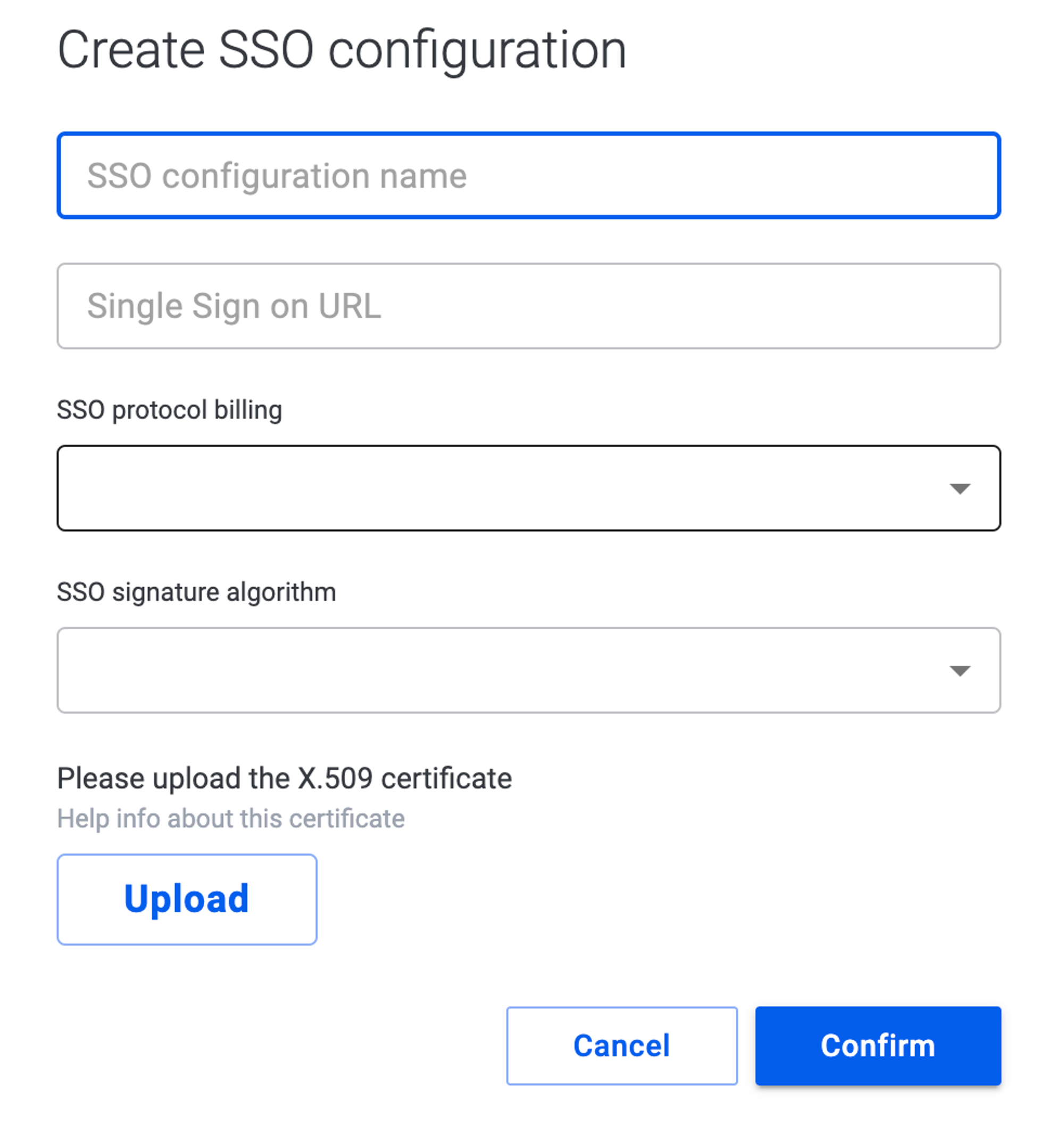 - Create a descriptive name for your SSO configuration. Enter the SSO URL, select the protocol and signature algorithm you used on your IdP platform, and upload the IdP certificate.