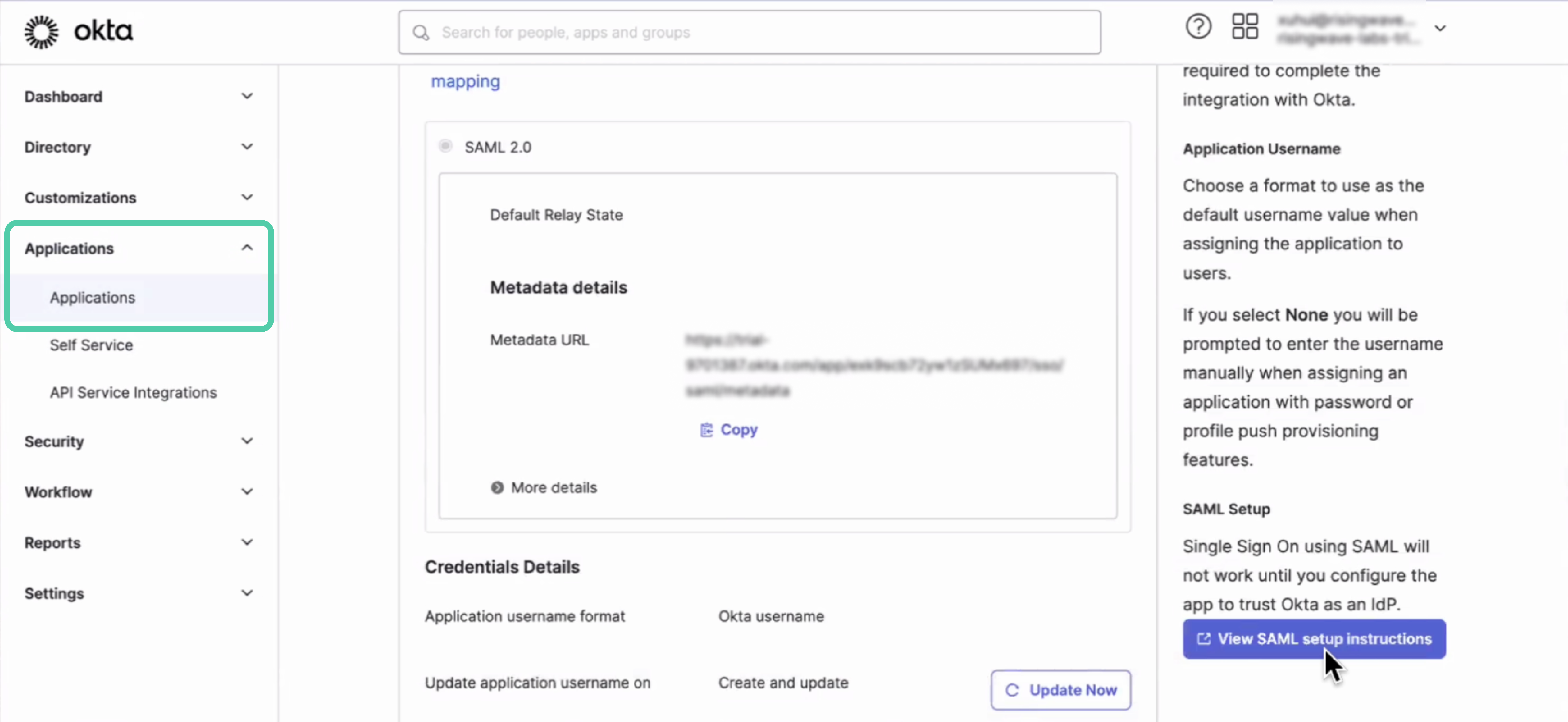 - Select the SAML application you created for RisingWave Cloud.