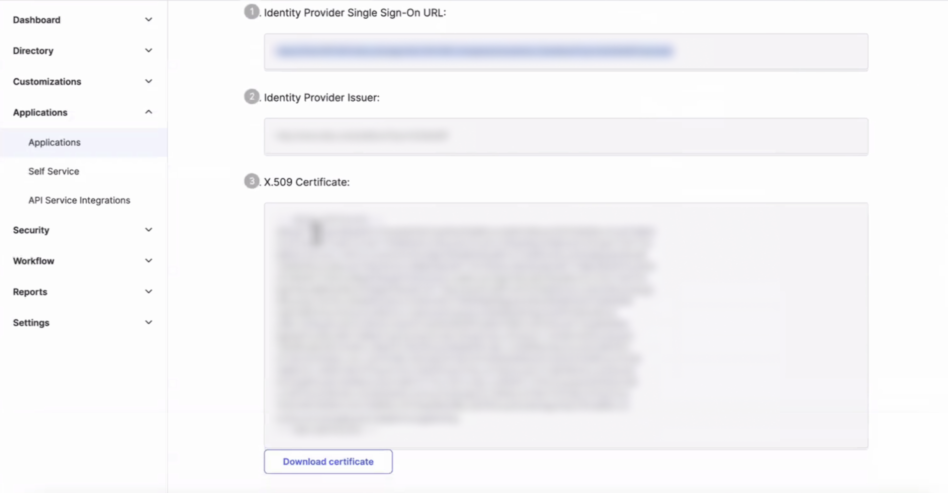 IdP Signature Certificate | PEM-encoded public key certificate of the IdP. You can obtain this value from your IdP. You can either upload the certificate from your computer or paste the contents into a text box. |