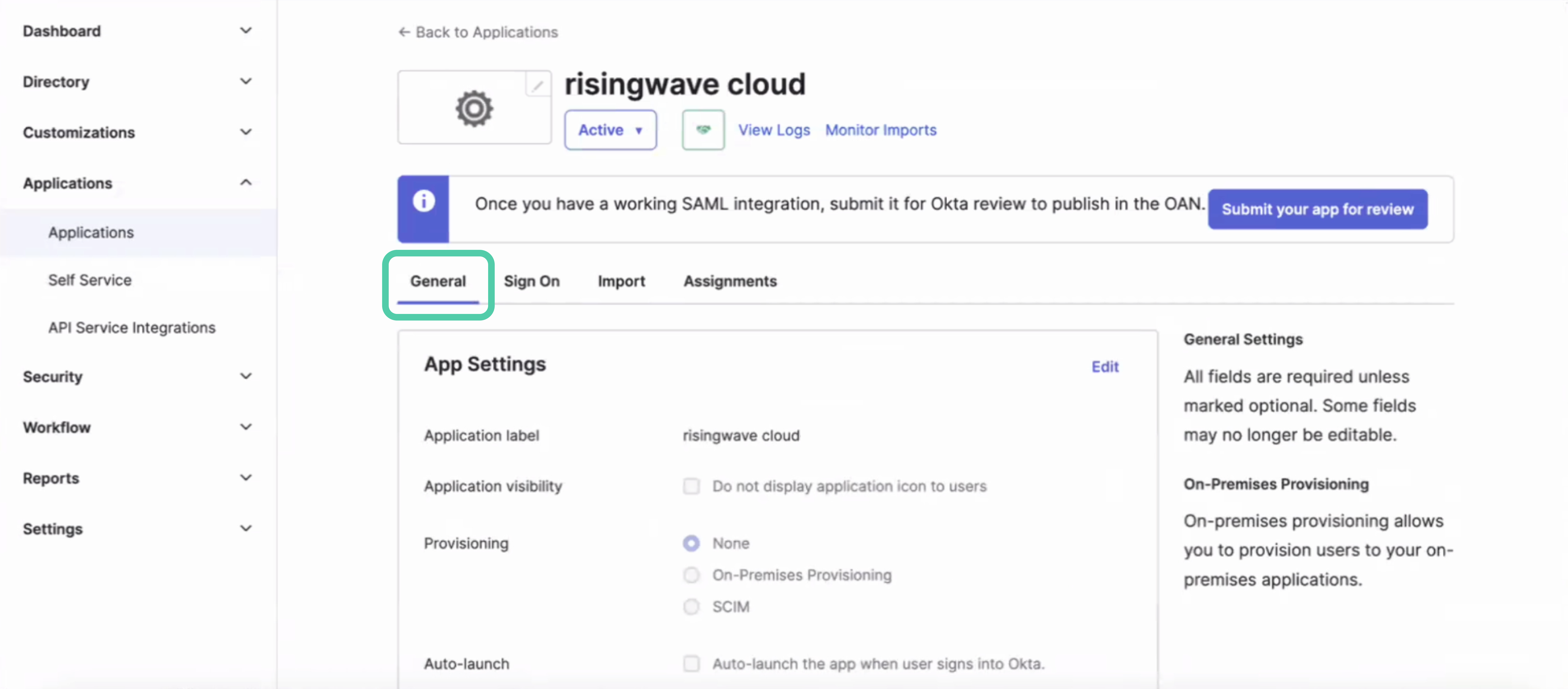 - In the SAML application for RisingWave Cloud, select the General tab.