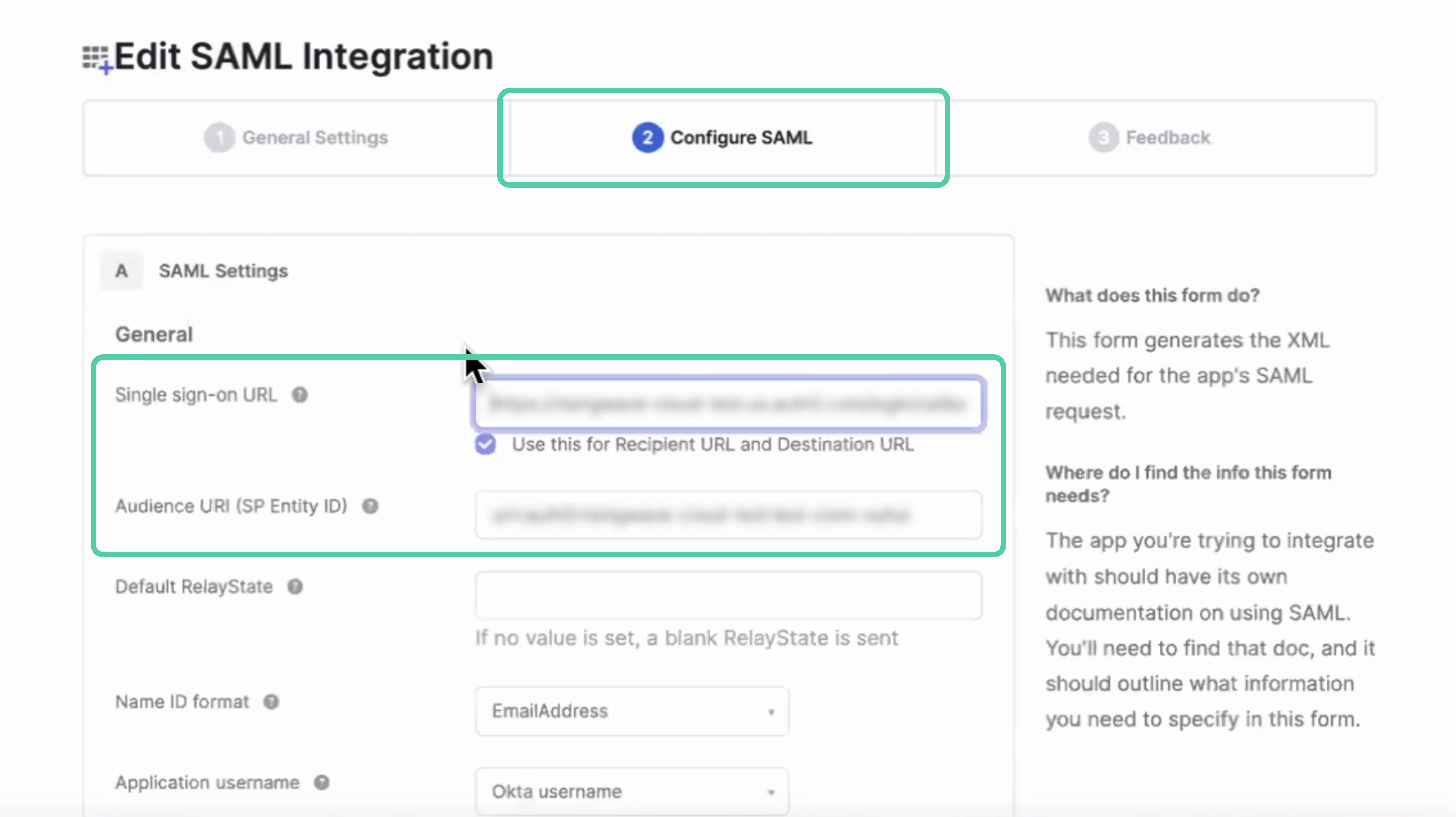 - Select the Configure SAML tab. Enter the