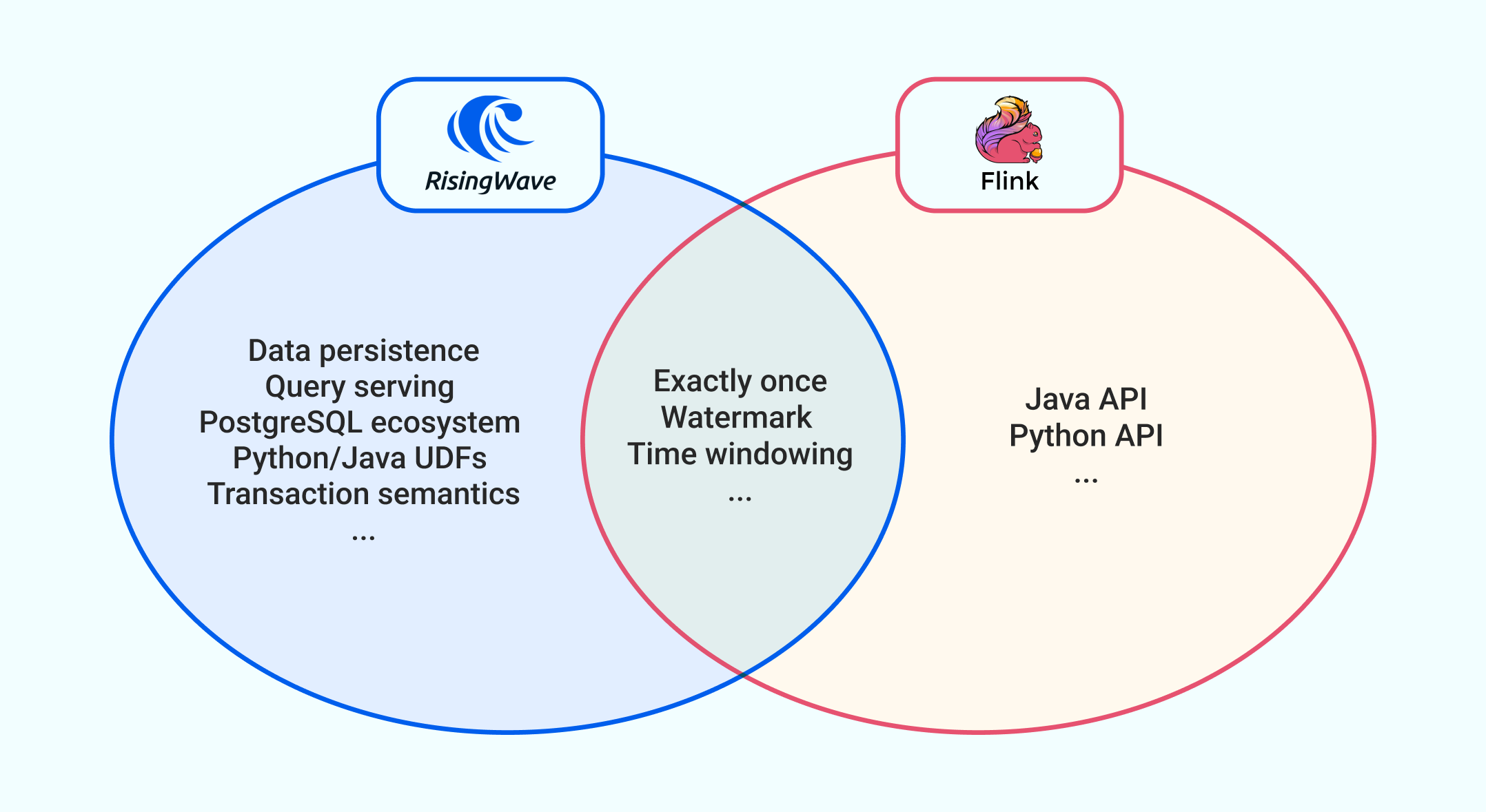 Apache Flink is a distributed stream processing framework; RisingWave is a distributed SQL streaming database.Apache Flink