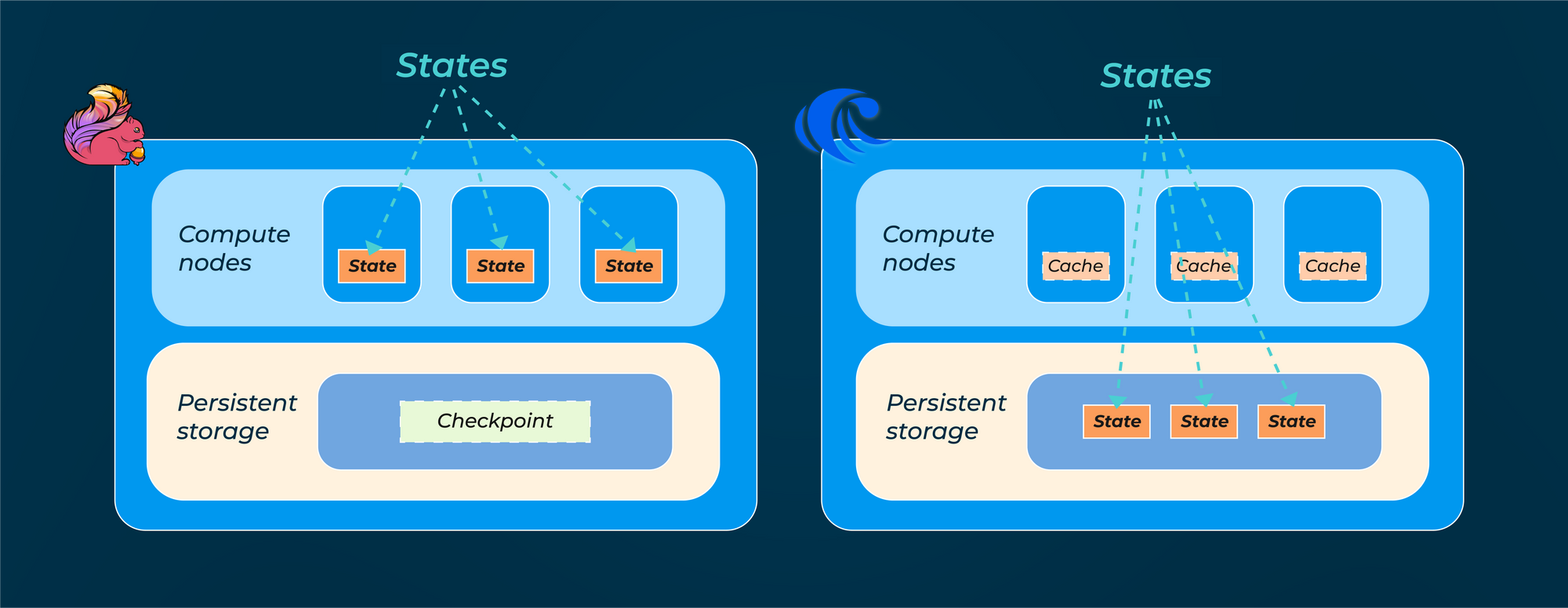 Apache Flink adopts a big-data style, coupled-compute-storage architecture that is optimized for scalability; RisingWave in contrast implements a cloud-native, decoupled compute-storage architecture that is optimized for cost efficiency.