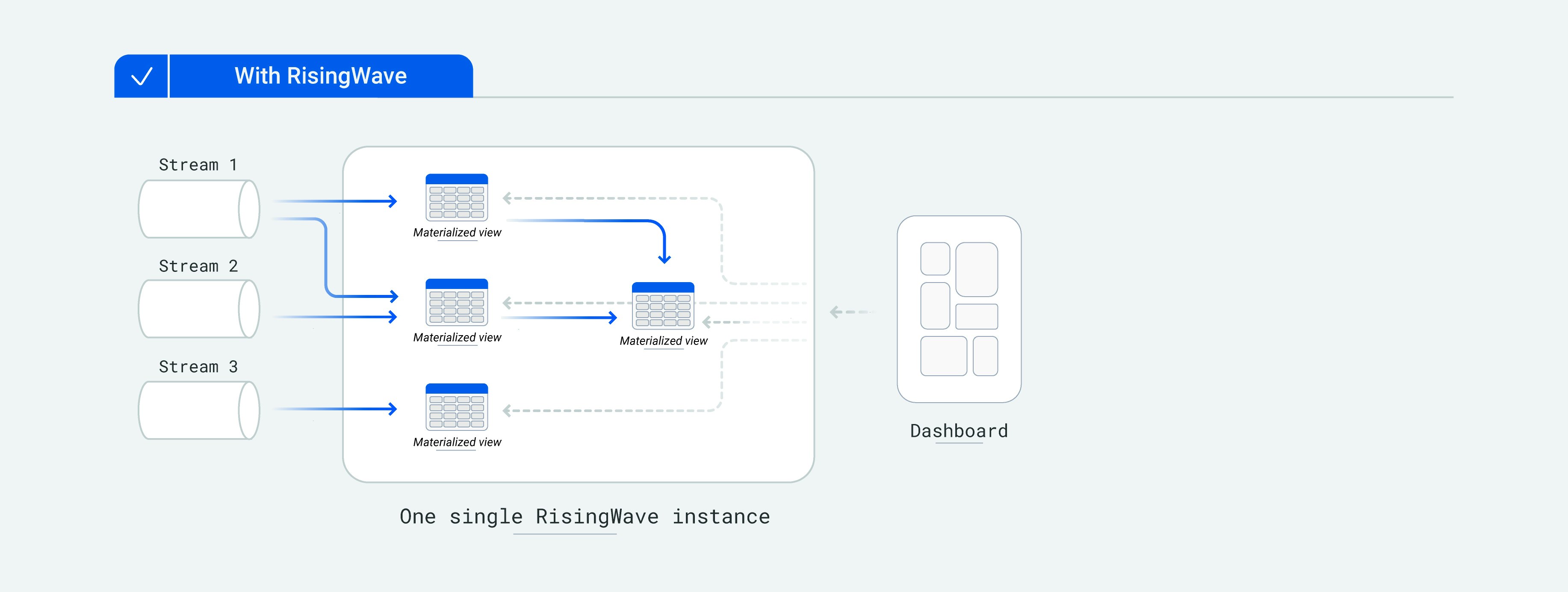 - As a streaming database, RisingWave implements the concept of materialized views, which provides users with opportunities to reuse computation resources across different stream processing pipelines by maintaining and sharing intermediate computation results.