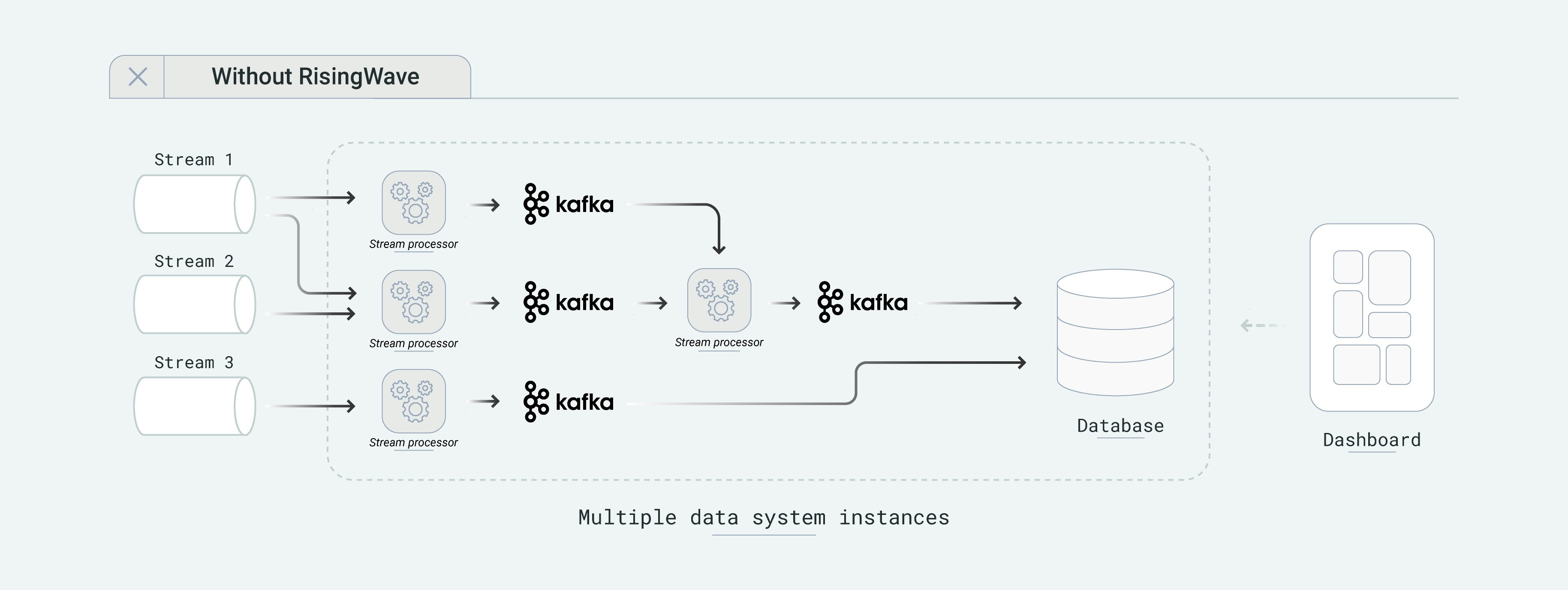 When developing applications using Apache Flink, developers need to manage multiple systems and handle the consistency relationships between them. When using RisingWave, developers only need to manage a single system and do not need to consider any relationships between different system components. When developing applications using Apache Flink, users need to connect multiple instances of a stream processing engine with multiple instances of message queues to express complex logic. To query the results, users must export the stream processing results to a dedicated downstream database and perform queries there. This architecture is complex, incurs high operational costs, and requires users to take responsibility for the consistency of computation results across systems. The diagram below illustrates the situation when building applications using traditional stream processing engines like Apache Flink. Developers need to manage multiple systems and handle the consistency relationships between them.