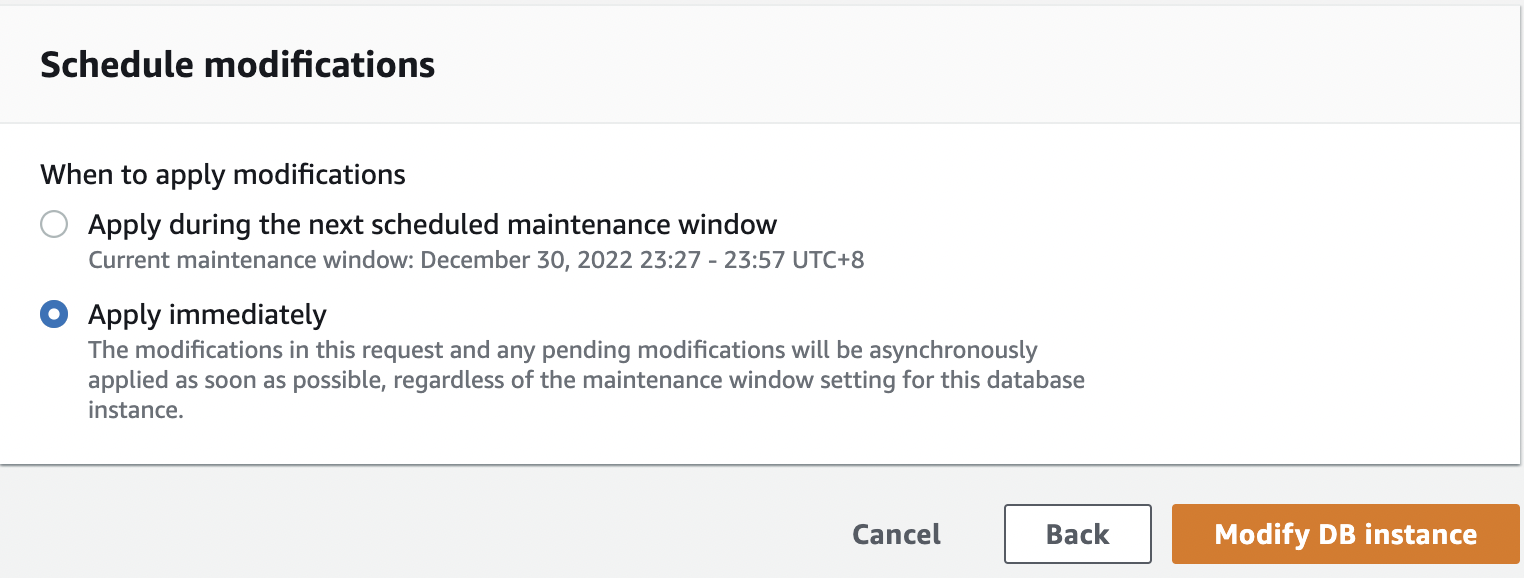 - Click Continue and choose Apply immediately. Finally, click Modify DB instance to save the changes. Remember to reboot your MySQL instance.