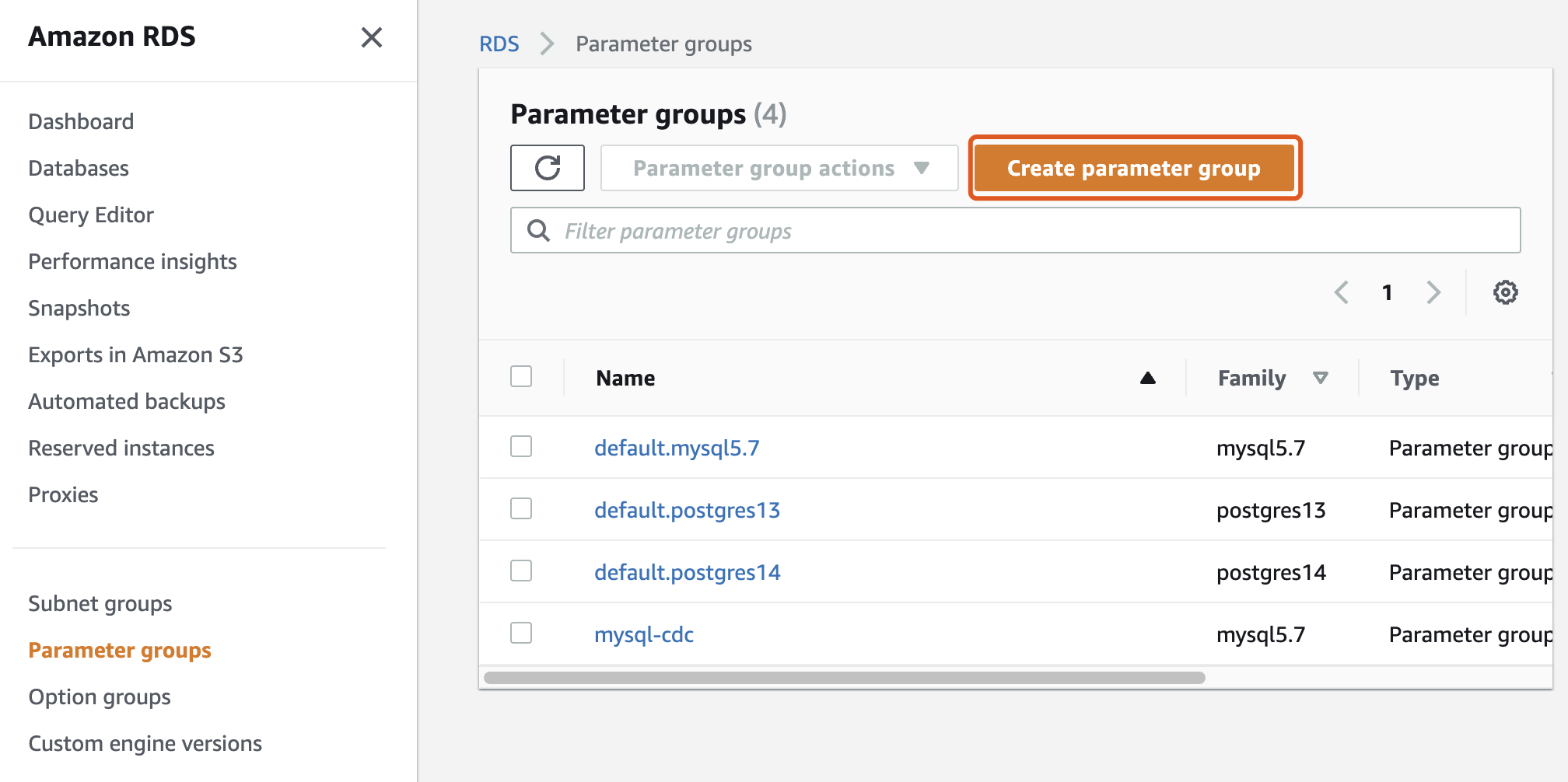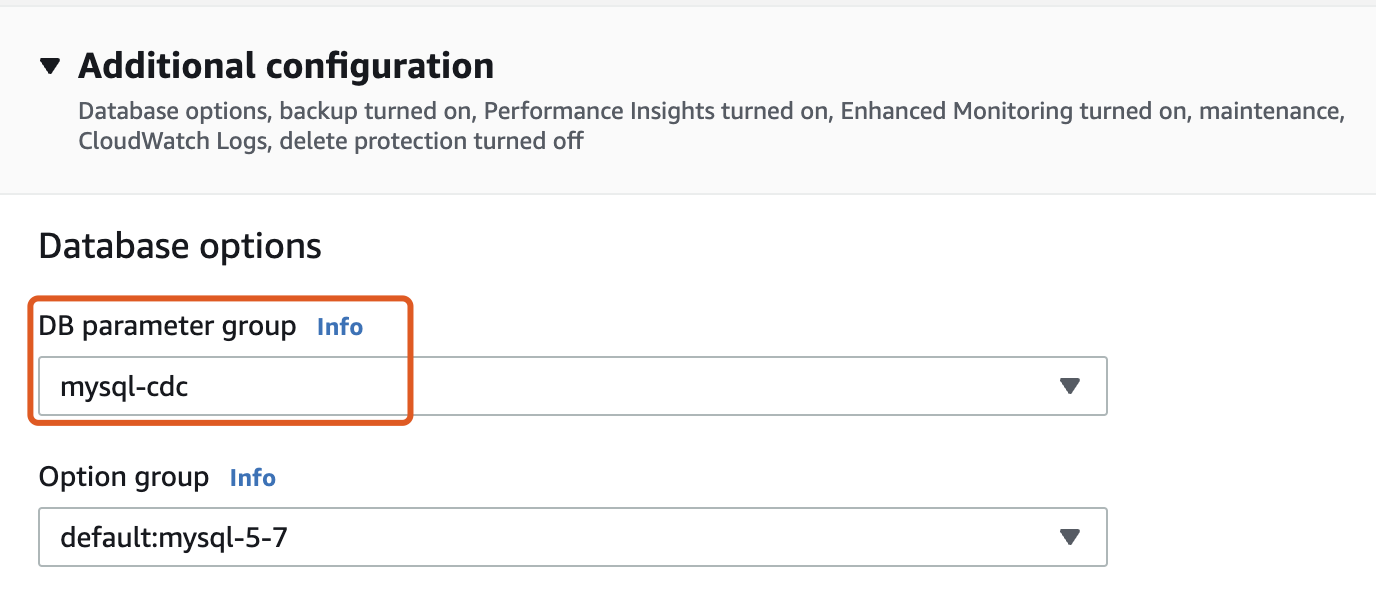 - Create a parameter group for MySQL instances. We created a parameter group named MySQL-CDC for the instance that runs MySQL 5.7.x.