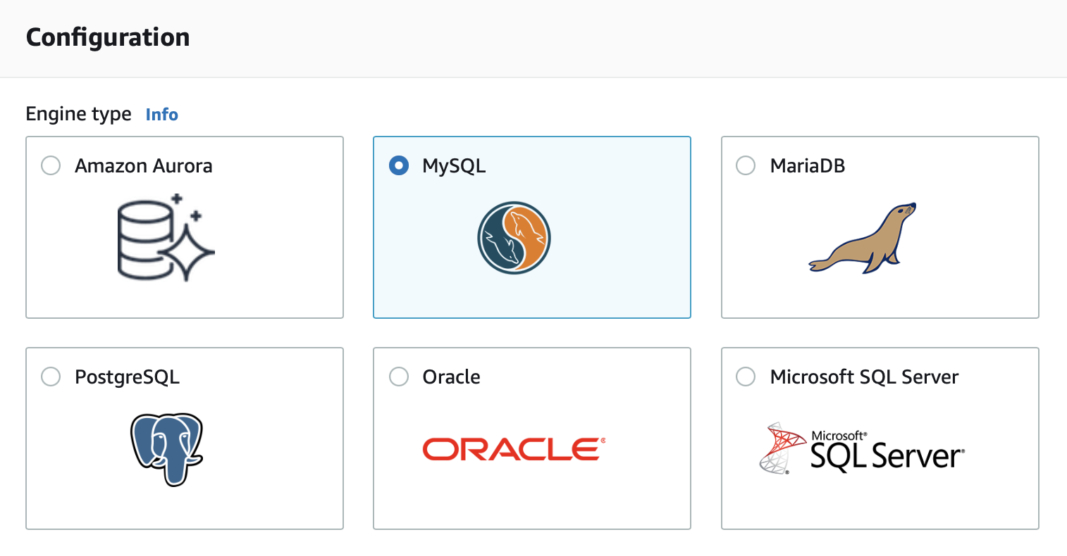 - Create a database with MySQL as the Engine type. We recommend setting up a username and password or using other security options.