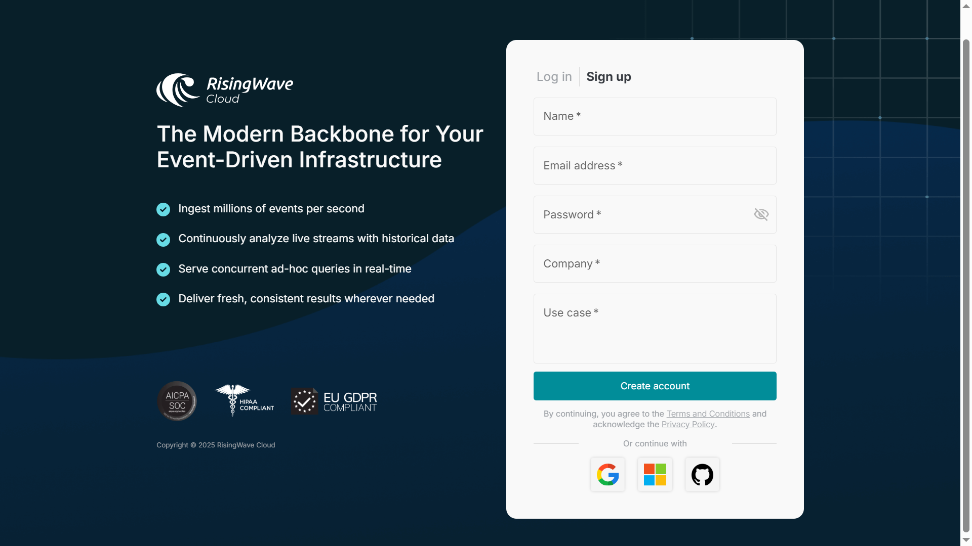 Create a RisingWave cluster in RisingWave Cloud using the free plan. For more information, refer to the RisingWave Cloud documentation.
