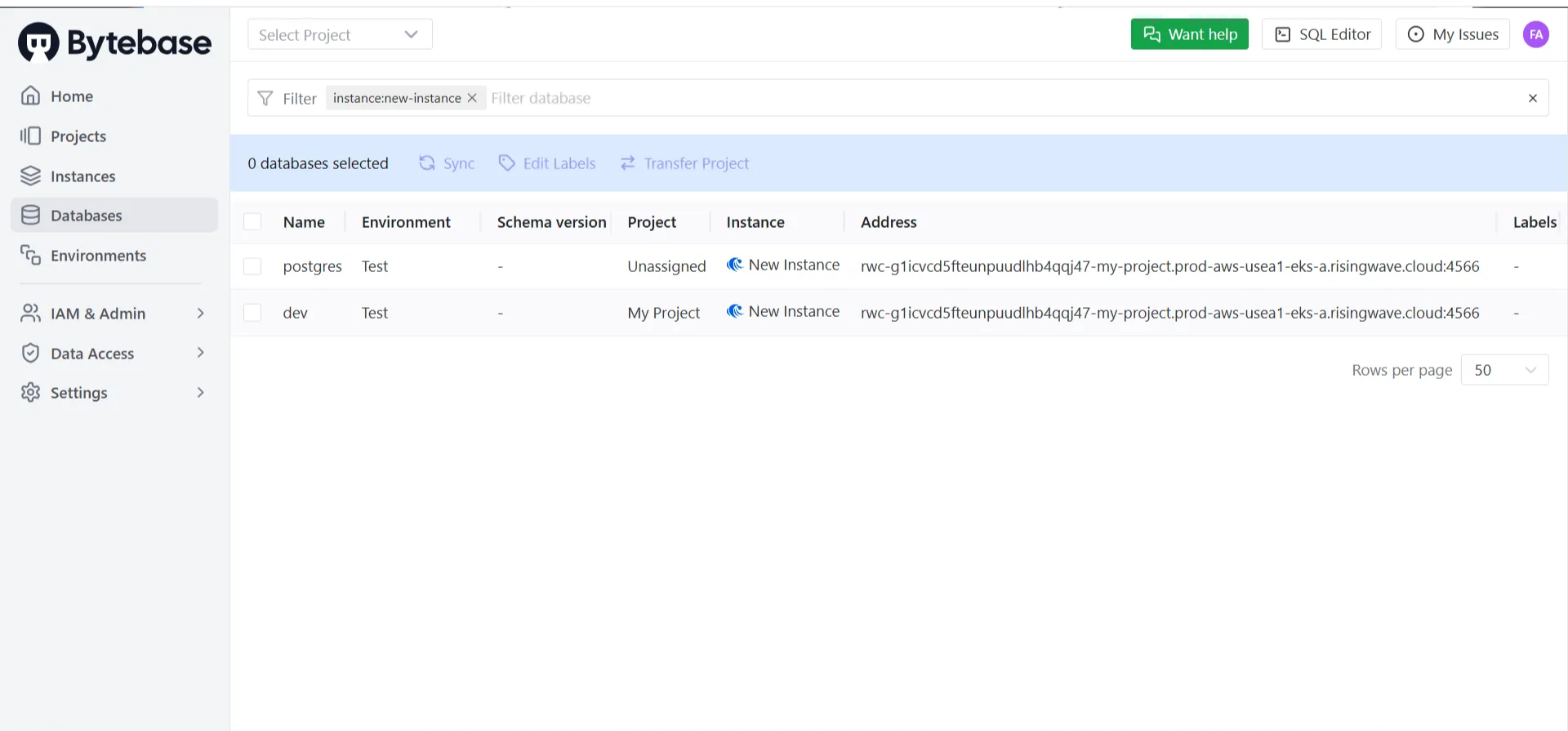 - Select RisingWave as the Instance type (since RisingWave is supported by Bytebase).