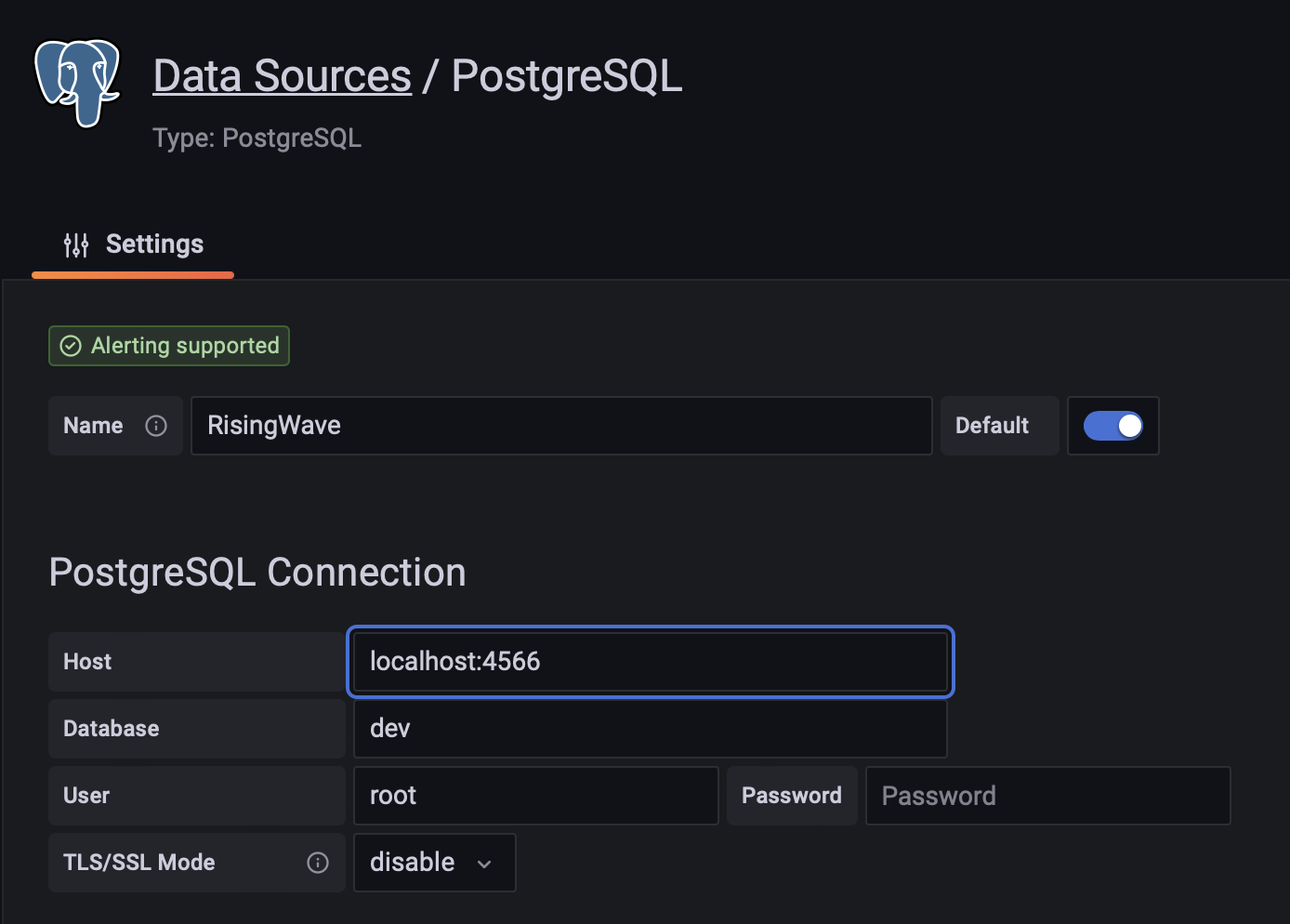 If both RisingWave and Grafana are started locally, the host domain can be either localhost:4566 or 127.0.0.1:4566.If you are running Grafana Cloud, the host domain should be your computer’s public IP address.