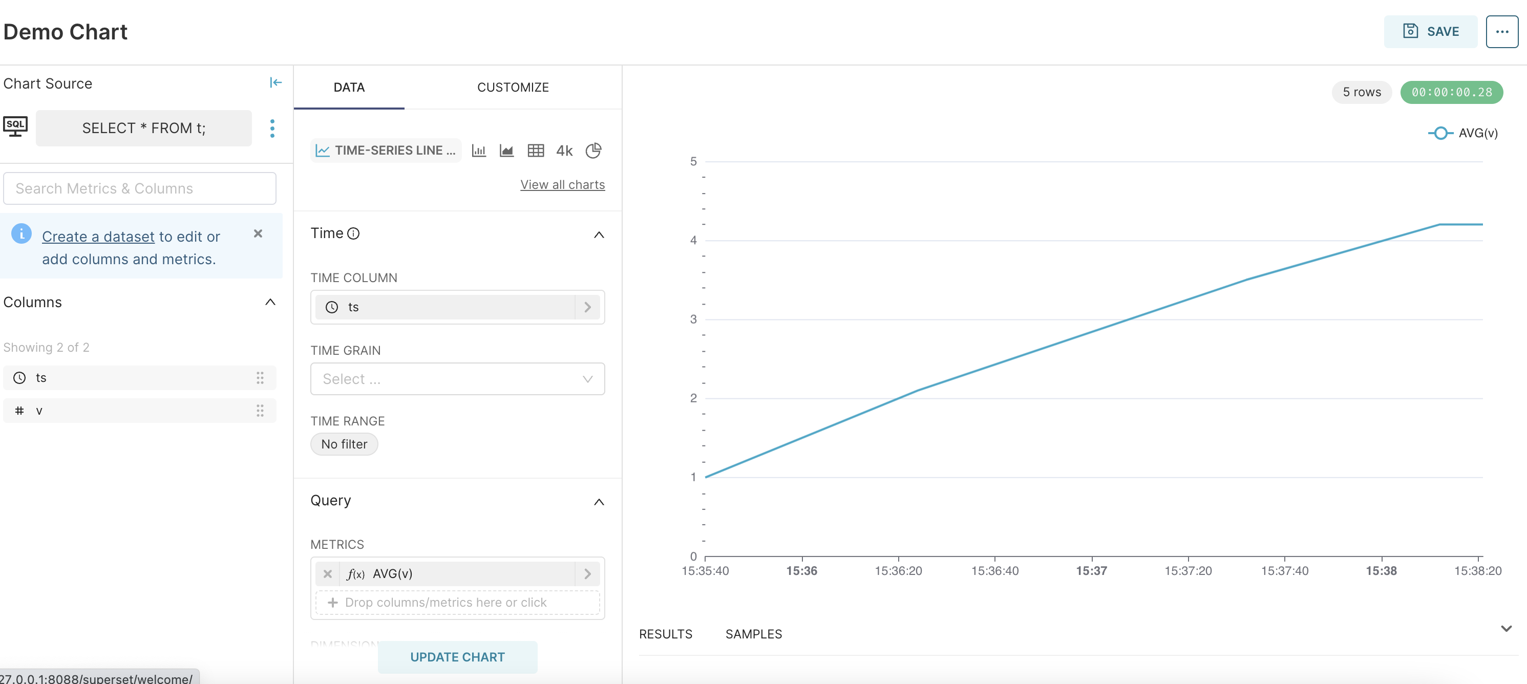 as the metric. - Click Update chart. The query results will be rendered into a line chart.