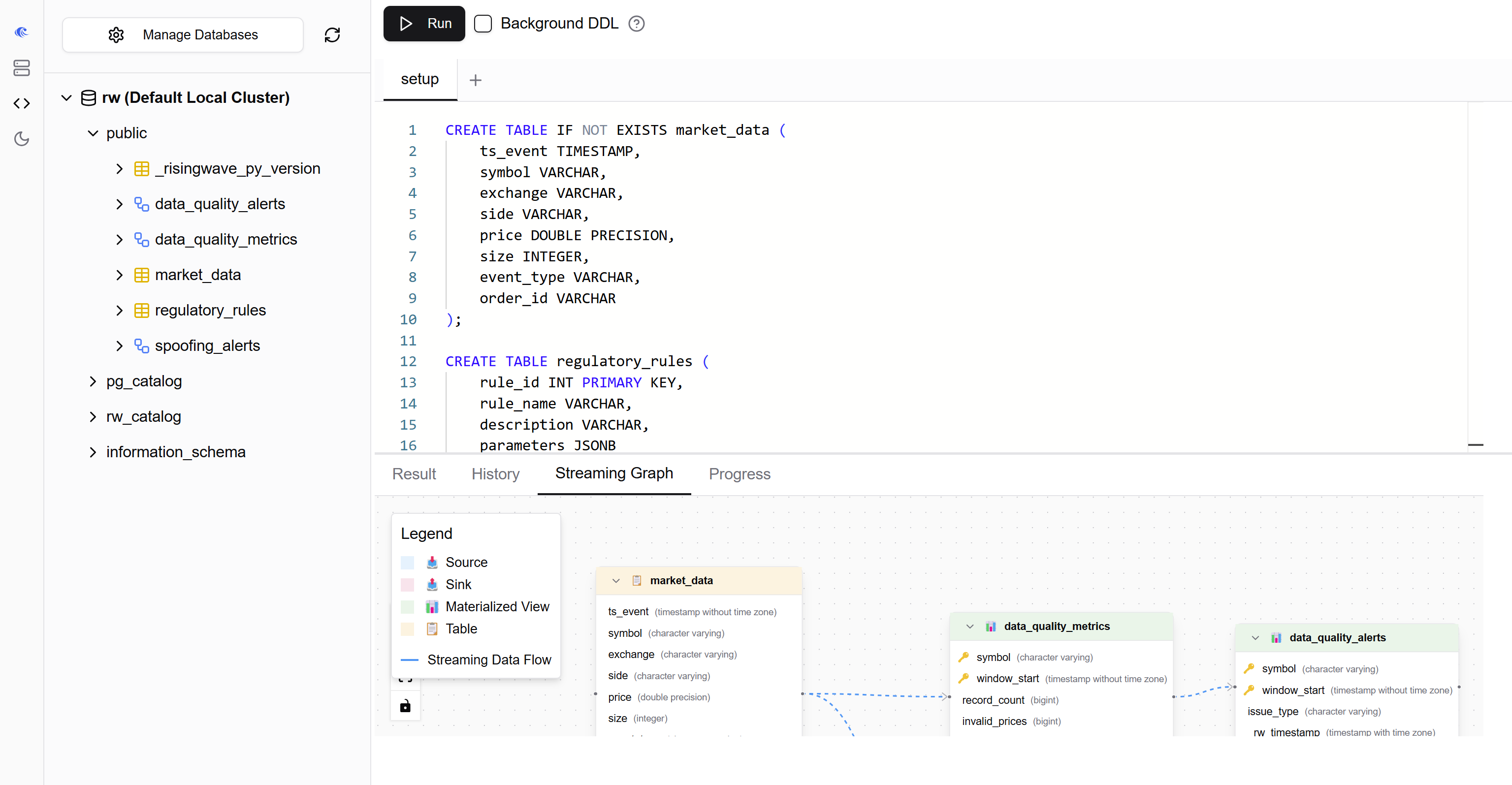 • Explore database schemas (tables, views, materialized views, sources, sinks).